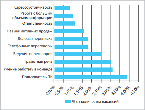 По мнению портала hh.ru востребованы такие soft skills, как деловое общение, грамотность, клиентоориентированность, работа с большим объемом информации, умение работать в команде. Среди hard skills (профессиональные и технические компетенции) работодатели наиболее часто отмечают знание английского языка, владение ПК, поиск информации в интернете, наличие водительского удостоверения, знание PowerPoint, а также работу с оргтехникой (рис. 1, 2).