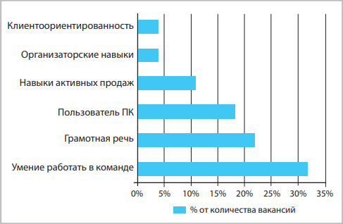 Рис. 1. Основные требуемые навыки в вакансиях для молодых специалистов в России в 2016 г.