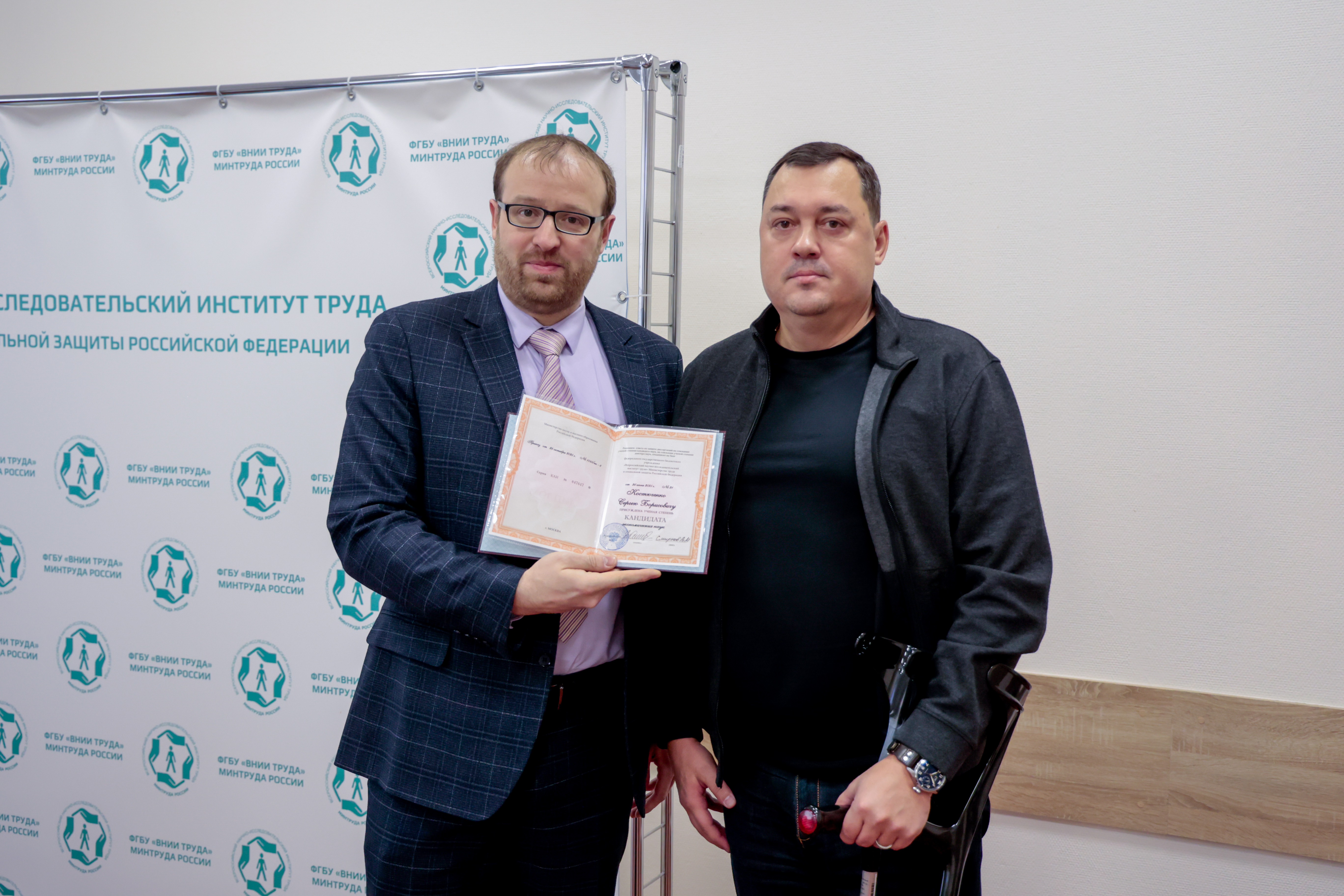 24 декабря состоялось заседание Ученого совета ФГБУ «ВНИИ труда» Минтруда России. В начале заседания и.о. генерального директора Владимир Смирнов вручил Сергею Костюченко и Никите Ненастьеву дипломы кандидатов экономических наук.